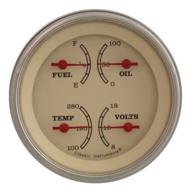The Vintage Series 3-3/8" Quad Temp, Volt, Oil and Fuel Gauge with Stainless Low Step Bezel Curved Glass Lens.