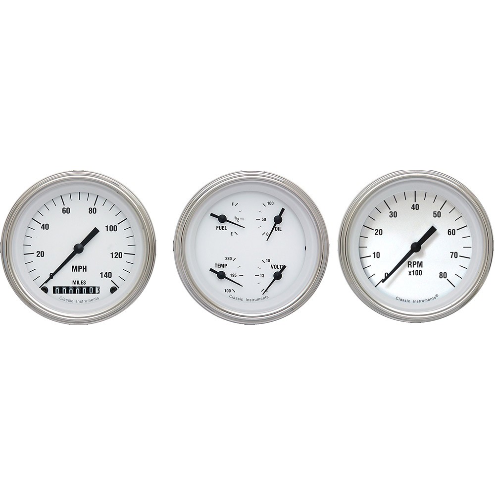 The 3 Gauge Kit in White Hot Series with 3-3/8" Speedometer, Tach and Quad with Fuel, Oil, Temp and Volt Gauges with Stainless Low Step Bezel Flat Glass Lens.