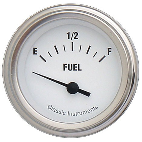 The White Hot Series 2-1/8" Fuel Gauge with 240-33 ohm Range with Stainless Low Step Bezel Curved Glass Lens.
