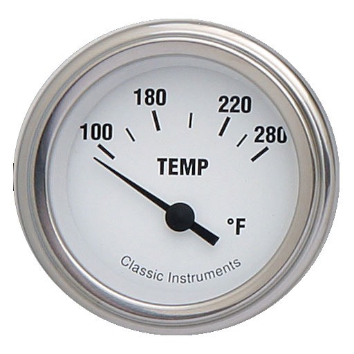 The White Hot Series 2-1/8" Water Temperature Gauge with 100-280 Degree Range with Stainless Low Step Bezel Curved Glass Lens.