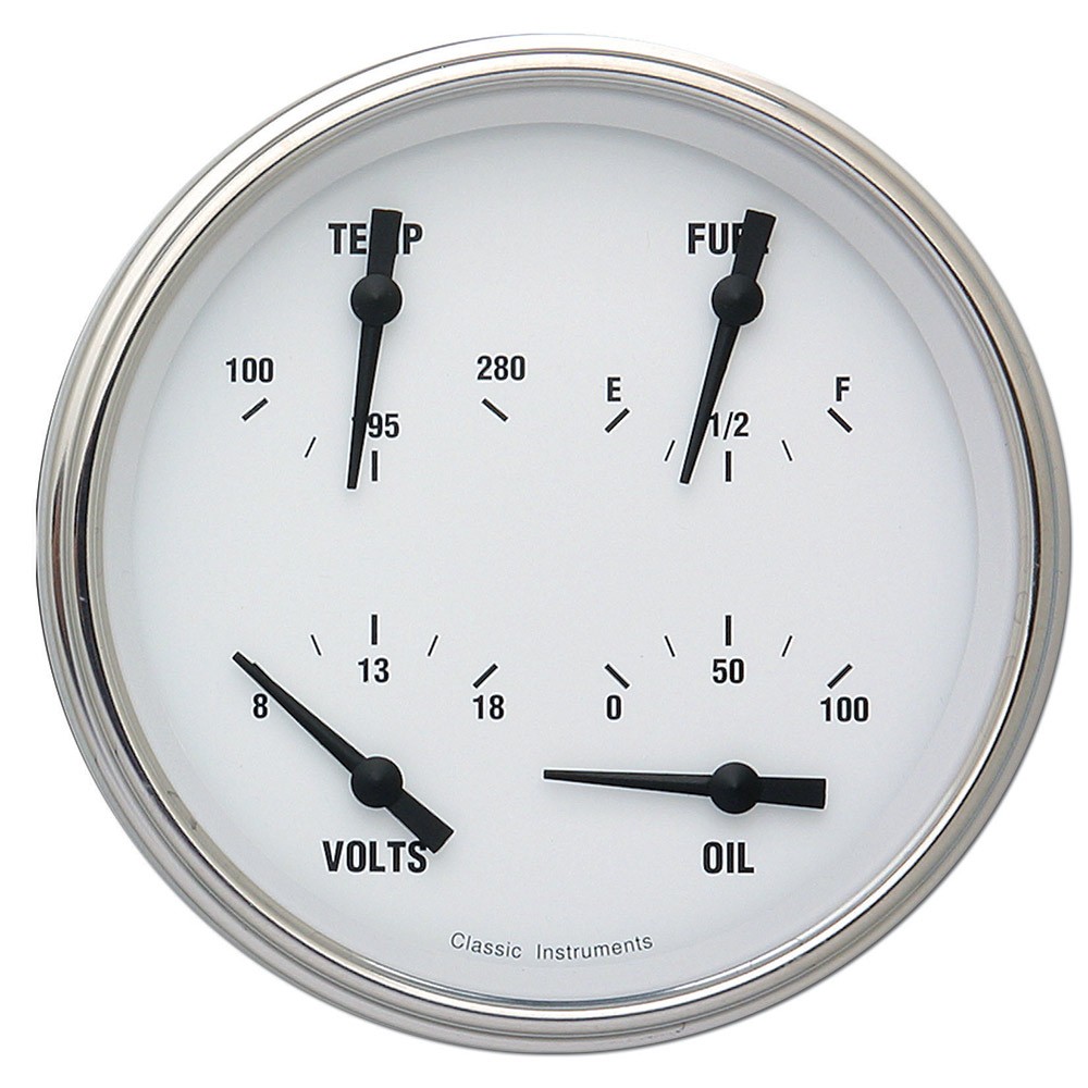 This White Hot Series 4-5/8" Quad Gauge with Fuel, Oil, Temp and Volt Gauges with Stainless Low Step Bezel Flat Glass Lens.