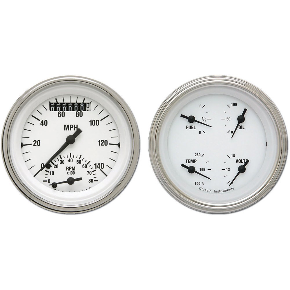 The 2 Gauge Kit in White Hot Series with 3-3/8" Ultimate Speedometer Speedo/Tach Combo and Quad with Fuel, Oil, Temp and Volt Gauges with Stainless Low Step Bezel Curved Glass Lens.