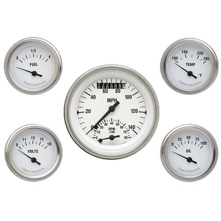 The 5 Gauge Kit in White Hot Series with 3-3/8" Ultimate Speedometer Speedo/Tach Combo and 2-1/8" Fuel, Oil, Temp and Volt Gauges with Stainless Low Step Bezel Flat Glass Lens.