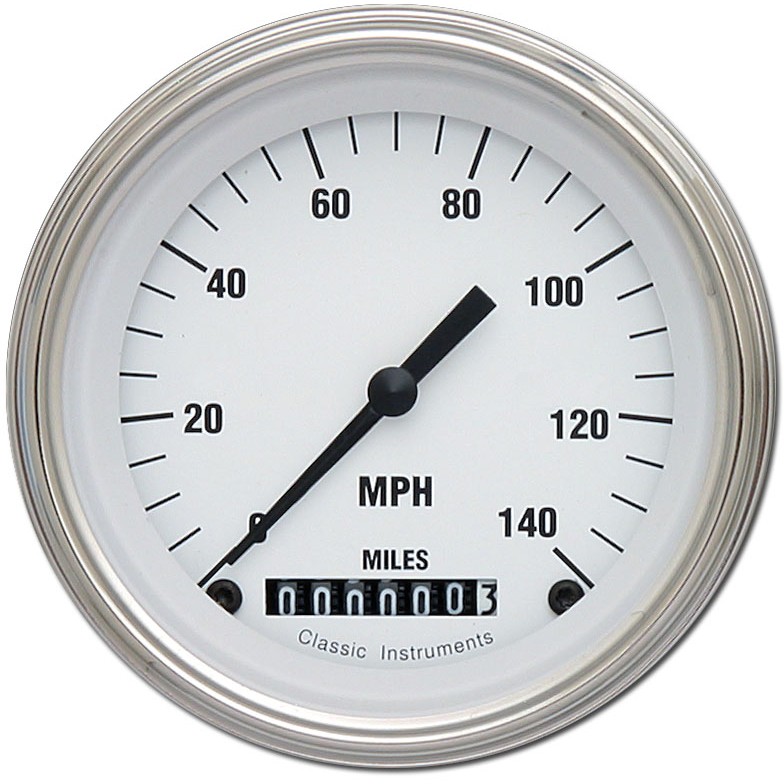 The White Hot Series 3-3/8" Speedometer Gauge with 0-140 mph Range with Stainless Low Step Bezel Curved Glass Lens.