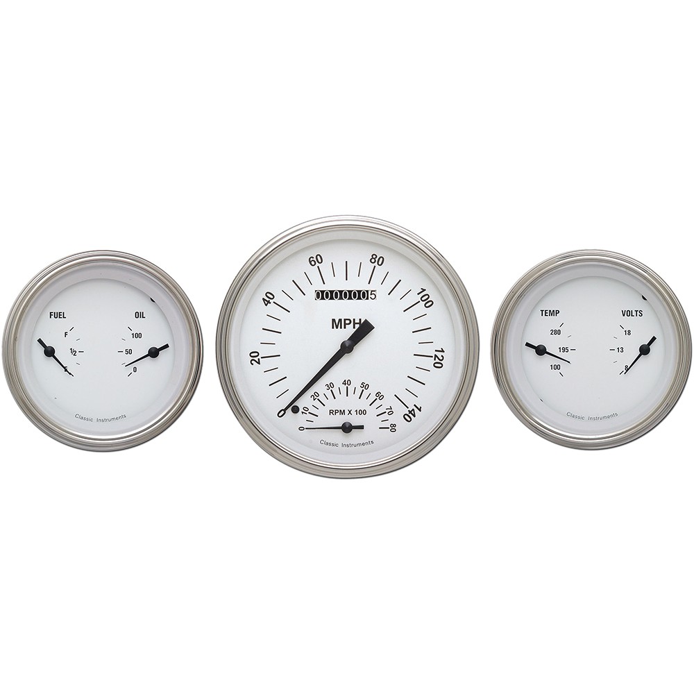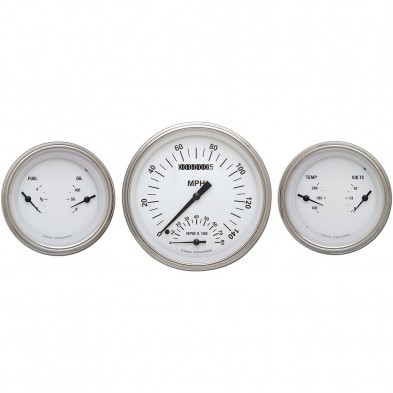 The 3 Gauge Kit in White Hot Series with 4-5/8" SpeedTachular Speedo/Tach Combo and 2 Duals with Fuel and Oil plus Temp and Volt Gauges with Stainless Low Step Bezel Flat Glass Lens.