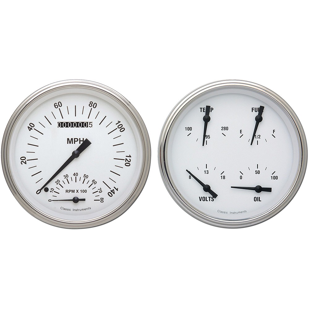 The 2 Gauge Kit in White Hot Series with 4-5/8" SpeedTachular Speedo/Tach Combo and Quad with Fuel, Oil, Temp and Volt Gauges with Stainless Low Step Bezel Flat Glass Lens.
