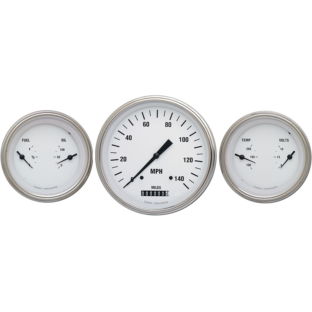 The 3 Gauge Kit in White Hot Series with 4-5/8" Speedometer and 2 Duals with Fuel and Oil plus Temp and Volt Gauges with Stainless Low Step Bezel Flat Glass Lens.