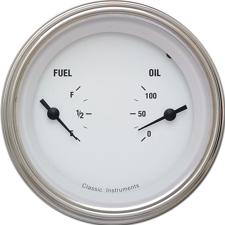 The White Hot Series 3-3/8" Dual Gauge with Fuel and Oil Range with Stainless Low Step Bezel Curved Glass Lens.