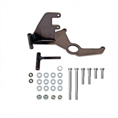 Mount for compressor and alternator when using tri-power or dual quad carbs. Bolts to water pump and intake. No head bolt holes required. Clears most tall valve covers. Moves compressor and alternator forward to clear intake oil filler.
