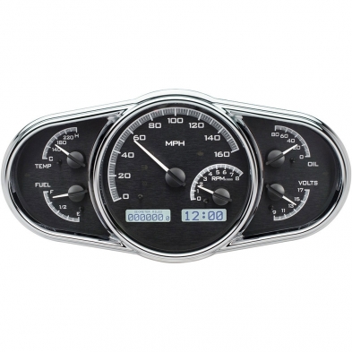 The new Dakota Ditigal Universal VHX-1016 Elliptical gauge cluster measures 10-1/8" W x 5" H and includes a triple-chrome plated, machined aluminum gauge housing.