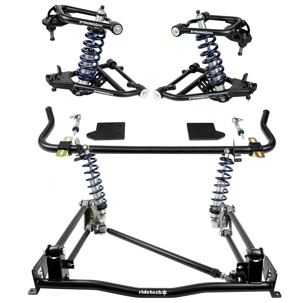 The RideTech Tri 5 CoilOver package includes everything you need to completely upgrade your existing suspension and give your vehicle that aggressive lower stance. Fitment includes the 1955-57 Chevy Bel Air, 150, 210 or Nomad The package contains front upper and lower control arms, front MuscleBar, rear 4-Link and 4 HQ Series CoilOvers for every corner of the vehicle. RideTech has spent hours collecting data to find a perfect spring rate and components for your vehicles performance and ride quality.