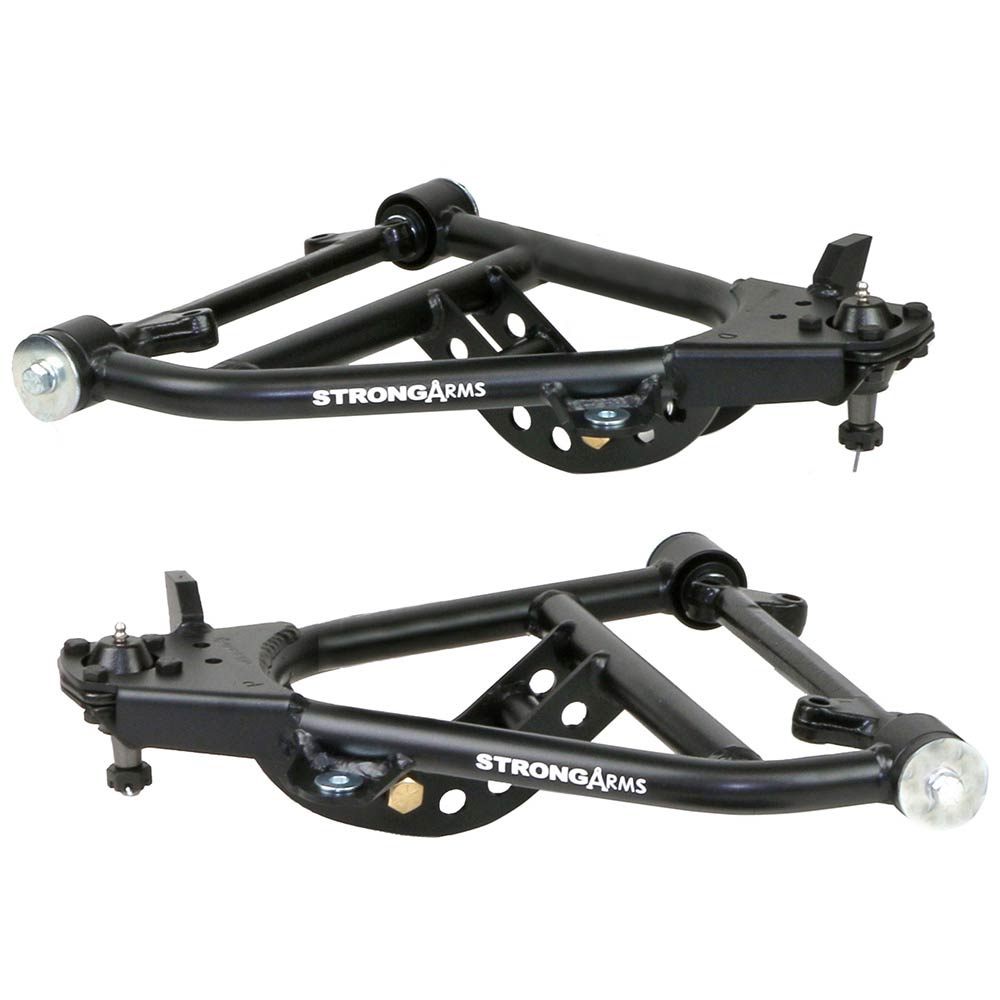 Features: Upper and Lower StrongArms with corrected ball joint angles. They are powder coated black and fully assembled with ball joints, bushing and cross shafts, ready for installation. HQ Series CoilOvers utilize an impact forged aluminum body and Monotube design to deliver excellent ride quality and handling. They allow fine tuning of the ride quality and handling the rebound knob is located at the top of the shock for under hood access. They come standard with a 1,000,0001 Mile Warranty. Interested in AutoCross or Road Course Racing? Consider the TQ Series CoilOvers. Front MucleBar Sway bar helps reduce body roll and includes the PosiLink end links that provide immediate engagement between the chassis and control arms. Bolt On 4-Link greatly improves traction, handling and ride quality. Installation does not require the any major modifications to the floor pan and requires only minimal welding to the axle tube. The R-Joint rod ends combine the best qualities of low friction movement, lateral stability, full range articulation and quiet operation into one special bearing that is as home on the street as it is on the racetrack!