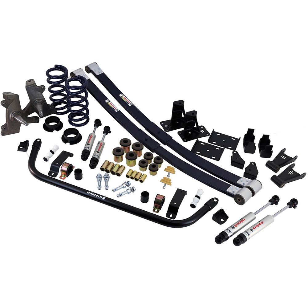 Lower your 1973-87 GM pickup while dramatically improving its handling and ride quality. Your Square Body really benefit from the StreetGRIP suspension system. The complete kit includes special composite leaf springs that shed a considerable amount of unsprung weight. The trick leaf springs also create a great stance in conjunction with dual rate coilsprings and dropped spindles. Self lubricating Delrin bushings reduce deflection without making noise. This kit features RideTech HQ Series adjustable monotube shock absorbers. These shocks are superior to the cheap twin-tube shocks sold in other kits with respect to handling, ride and durability. When choosing a suspension kit, it is important to keep in mind that shocks are one of the most important parts of the equation. RideTech shocks are so good, they carry a million and one mile warranty. StreetGRIP and Square Bodies go great together.