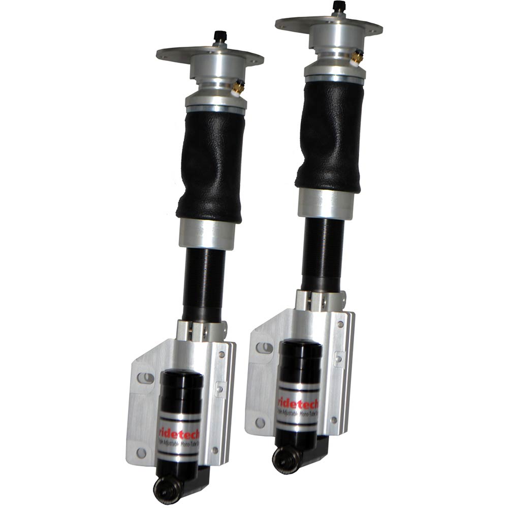 RideTech offer these shocks for your 2005-14 Ford Mustang with TQ Series ShockWave Air Struts for track ready handling, instant ride height adjustment and bolt-on installation. This 3 way adjustment provides precise tuning capability. Piggyback reservoirs provide consistent fluid temps in all environments, as well as easy access to compression tuning knobs. The TQ or Track Quality Series Struts provide single rebound adjustment combined with dual stage high speed and low speed and compression adjustment. The high speed adjustment feature allows tuning of instances that might induce a high speed excursion of the piston rod. This includes rapid changes in suspension loading such as quick directional transitions in autocross competition. The high speed adjustment also allows fine tuning for impact harshness typically found during street driving such as potholes, speed bumps and other road problems. Low speed adjustment allows tuning of ride quality, as well as the general cornering characteristics of typical road course and winding road cornering use. The TQ Series Struts are the ultimate choice for autocross, track days, drag racing and ultra high performance street use.