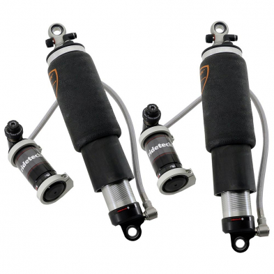 TQ Series ShockWaves mount in your 1968-70 Dodge and Plymouth B-Body cars and Universal applications just like. CoilOvers and deliver great ride quality, handling with adjustable air ride stance. RideTech's patented, integral shock within a spring air spring and shock absorber assembly is a proven winner at shows and in motion. Triple adjustable TQ Series shock absorbers feature single rebound adjustment plus dual high and low speed compression adjustment. You can fine tune the settings to your exact vehicle specs and driving style. TQ Series ShockWaves feature remote mount reservoirs for consistent fluid temps, plus easier access to the two compression tuning knobs. Advanced technology hides within the shocks. The mono tube design Features large 1.834" pistons, heavy duty 5/8" shafts and impact forged bodies. Since TQ Series ShockWaves are built to perform and made to last, they are backed by RideTech's exclusive 1,000,001 mile warranty. They understand your muscle car's suspension as well as any other company. Shock calibrations and air spring specs are based on more than 20 years of extensive air ride development on the street, highways and race tracks. It all adds up to predictable handling that is comparable to CoilOvers but with instant ride height adjustment. This kit includes two triple adjustable TQ Series ShockWaves with remote reservoirs.